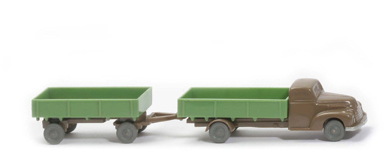 Achsen | Rollachser | Farbe Kabine u. Chassis | blassbraun | Kabinenboden | geschlossen | Bodenplatte Prägung | WM im Kreis | Bemalung Kabine | Scheinwerfer, Stoßstange | Pritsche | Seiten glatt | Farbe Pritsche | maigrün | Zughaken | nach unten | Zapfen | Flachzapfen | Befestigung Pritsche | geklebt | Räder | 10mm, mit Profil |