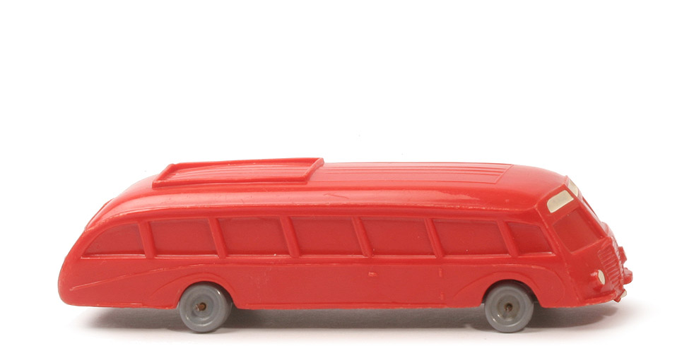 Achsen | Drahtachser | Farbe Aufbau | orangerot | Fenster | geschlossen | Gepäckbrücke | integriert | Bemalung Front | Grill, Scheinwerfer, Zielfenster weiß | Bemalung Radkästen | ohne | Bemalung Heck | Kennzeichen weiß | Rückleuchte | ohne | Reserverad | ohne | Beschriftung | ohne | Chassis | misch grau/grün | Bodenprägung | ohne WM | Räder | ca. staubgrau |