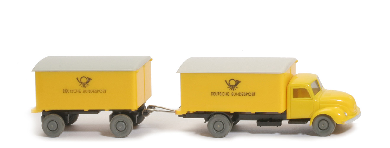 Farbe Kabine | gelb | Version Kabine | Typ 4 | Stoßstange | senkrecht | Kabinenboden | mit Schlitz | Blinker | ohne | Dach | glatt | Verglasung | getönt | Bemalung | Scheinwerfer und Stoßstange | Chassis Farbe | schwarz | Chassis Art | Variante 3b | Achshalterungen | offen | Chassis Bodenprägung | WM, Made in Germany | Zughaken | in Chassis integriert | Rückleuchten am Chassis | mit | Koffer Farbe | gelb | Koffer | Typ 2d | Rückleuchten | neu, rot bemalt | Positionslichter vorn | mit | Türaufnahmen | unten geschlossen | Türen Farbe | gelb | Türen Typ | Griff als Lasche, ohne Rand | Dach | glatt, ohne Rand und Positionsleuchten | Dach Farbe | braunweiß | Nummerschild | am Koffer, unbemalt | Beschriftung | Horn, DBP (...siehe Foto) | Beschriftung Art | Druck | Räder | 11 mm glatt |