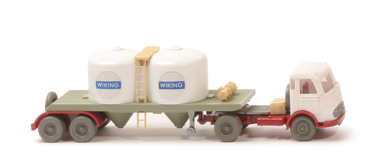 | Zugmaschine | Kabine Farbe | weiß | Fenstersteg | breit | Fixierung Reserverad | mit | Verglasung | klar | Inneneinrichtung | ca. hellbraunrot | Grill | silbern eingesetzt | Chassis | hellbraunrot | Bodenprägung | WM, Made in Germany | hintere Stoßstange links | mit | Zughaken | mit | hintere Stoßstange rechts | ohne | Reserverad | hinter Kabine | Sattelpfanne | neu, für dünnen Bolzen | Werkzeugkiste | hellbeige | Räder | 12mm, hellgrau, 10-Loch | | Auflieger | Tanks | weiß | Basis | hellgraugrün | Königsbolzen | dünn, eingesetzt, mit Wulst | Farbe Königsbolzen | silbern | Leitern Pumpeinheit | hellbeige | Achseinheit | hellbraunrot | Art Achseinheit | alt mit Schlitzen (MiG) | Stützrollen | silber | Reserverad | Felge nach innen | Beschriftung | Wiking (s. Foto) | Art der Beschriftung | Druck auf Silberfolie | Räder | 12mm, hellgrau, 10-Loch |