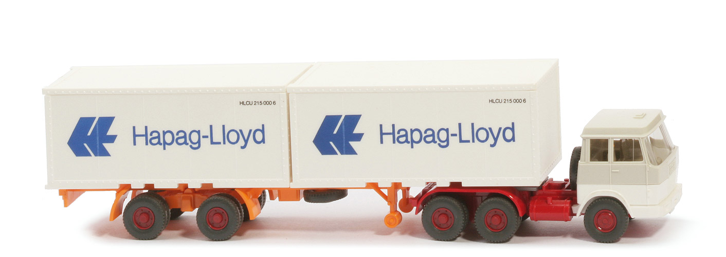 | Zugmaschine | Kabine oben | grauweiß | Kabine unten | weiß | Verglasung | klar | Inneneinrichtung | ca. hellgelbgrau | Lenkrad | ohne | Chassis | rot | Radlauf hinten | rot, 1-teilig | Sattelpfanne | für großen Königsbolzen | Reserverad | hinter Kabine | Räder | Profil grob | Felgen | hellbraunrot | | Container | Art | 2 x 20 ft neu | Farbe | weiß | Türen | alt | Beschriftung | Hapag-Lloyd (s. Foto) | Beschriftung Art | 36mm, mit Nummer | | Auflieger | Farbe | orangegelb | Unterfahrschutz | ohne | Königsbolzen | stark | Räder | Profil grob | Felgen | hellbraunrot |