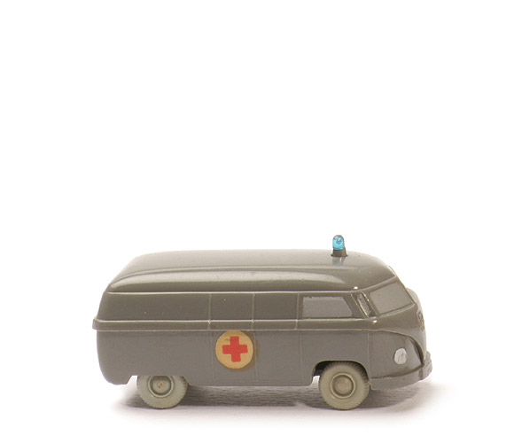 | Achsen | Rollachser | | Karosserie oben | betongrau | | Seite | nur ein Seitenfenster | | Front | VW Emblem | | Karosserie unten | betongrau | | Bodenprägung | WM (im Kreis), Made in Germany | | Blaulicht | auf silbernem Sockel | | Bemalung Scheinwerfer | silbern | | Bemalung Stoßstange vorne | ohne | | Bemalung Heck | ohne | | Scheibensilberung | mit | | Beschriftung | Rotes Kreuz auf heller Fläche | | Beschriftung Art | Abziehbild | | Räder Typ | 8 mm, mit Profil | | Räder Farbe | ca. lichtgrau |