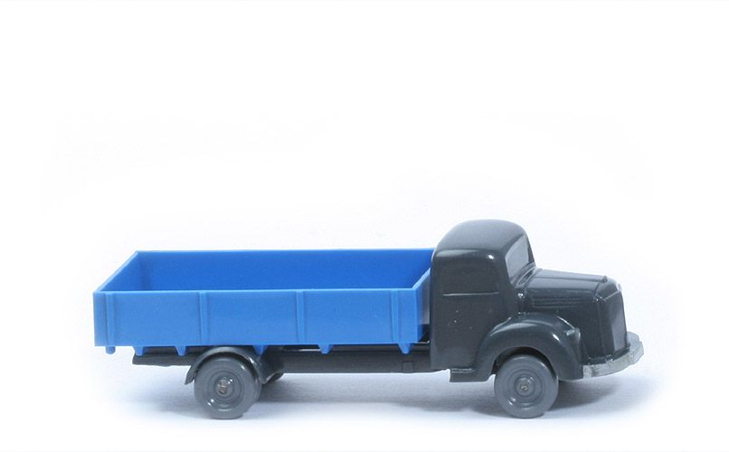 Achsen | Rollachser | Farbe Kabine u. Chassis | dunkelbasaltgrau | Kabinenboden | offen | Innenprägung | ohne | Grill | glatt | Bemalung Kabine | Scheinwerfer, Stoßstange | Pritsche | Seiten glatt, keine Kante oben | Farbe Pritsche | himmelblau | Zughaken | nach unten | Zapfen | Rundzapfen | Befestigung Pritsche | nur gesteckt | Räder | 10mm, ohne Profil |