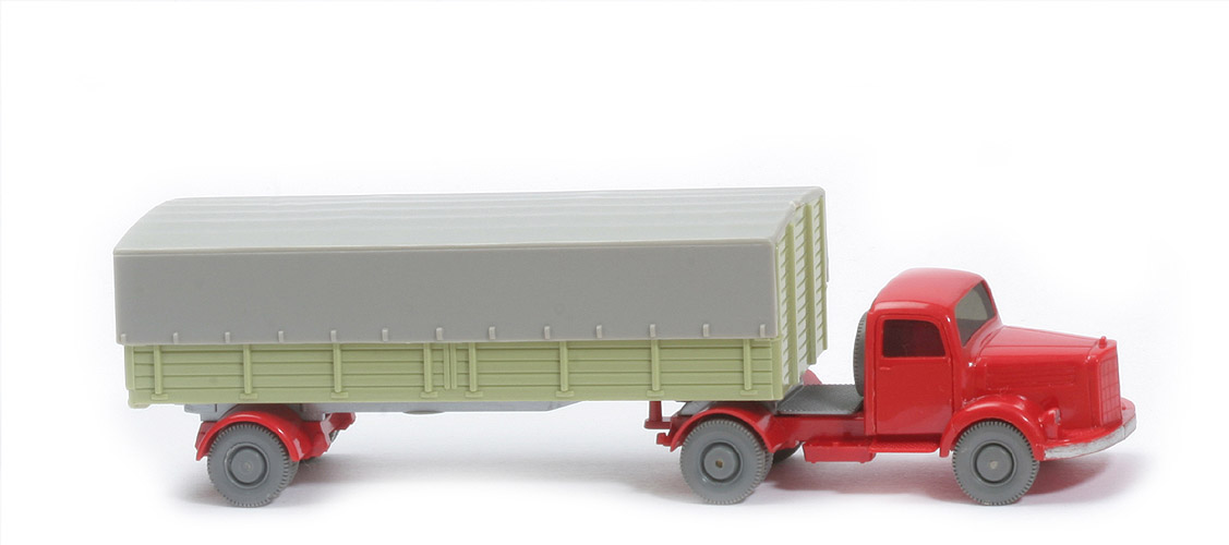 | Zugmaschine | Farbe Kabine | rot | Version Kabine | mit Schlitz hinter Nrn-Schild | Farbe Chassis | rot | Bemalung | Scheinwerfer, Stoßstange | Sattelpfanne | alt, ohne Steg, für kleinen KöBo | Chassis | Version 3a | Achshalterungen | offen | Bodenprägung | WM (ohne Kreis) | Reserverad | hinter Kabine | Räder | 11mm, glatt | | Auflieger | Farbe Pritsche | lindgrün | Farbe Chassis | silber | Farbe Achseinheit | rot | Bodenprägung Pritsche | WM (ohne Kreis) | Bodenprägung Chassis | WM hinter Königsbolzen | Königsbolzen | mittig auf Aufnahmeplatte | Rückleuchten | mit | Nummernschild | unbemalt | Achshalterung | offen | Räder | 11mm, glatt | | Plane | Farbe | ca. achatgrau | hinten | offen | Innenprägung | ohne |