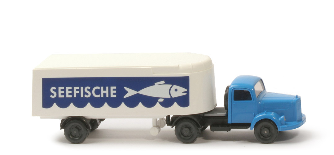 | Zugmaschine | Kabine | himmelblau, mit Blinkern | Chassis | Neuauflage, schwarz | Bemalung | Scheinwerfer silber | Sattelpfanne | für den großen KöBo | Achshalterungen | offen | Bodenprägung | neues WIKING-Logo | Reserverad | hinter Kabine | Räder | 10 mm, 6-Loch einteilig | | Auflieger | Farbe Oberteil | weiß | Farbe Unterteil | weiß | Radlauf | mit Kotflügeln, schwarz | Bodenprägung | neues WIKING-Logo | Rückleuchten | mit | Dach | mattiert | Beschriftung | Seefische - Druck (s. Foto) | Räder | 10 mm, 6-Loch einteilig |
