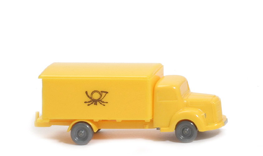 Achsen | Rollachser | Farbe Kabine u. Chassis | gelb (deutlich satter als Aufbau) | Kabinenboden | Platte silbern | Bodenprägung | WM im Kreis | Grill | mit Struktur | Bemalung Kabine | Scheinwerfer, Kennzeichen silbern | Koffer Typ | flacher Koffer Typ 1a | Farbe Koffer | gelb | Farbe Dach | gelb | Farbe Türen | gelb | Beschriftung | frühes Horn | Beschriftung Art | Druck | Kennzeichen am Koffer | silbern bemalt | Räder | 10mm, ohne Profil |