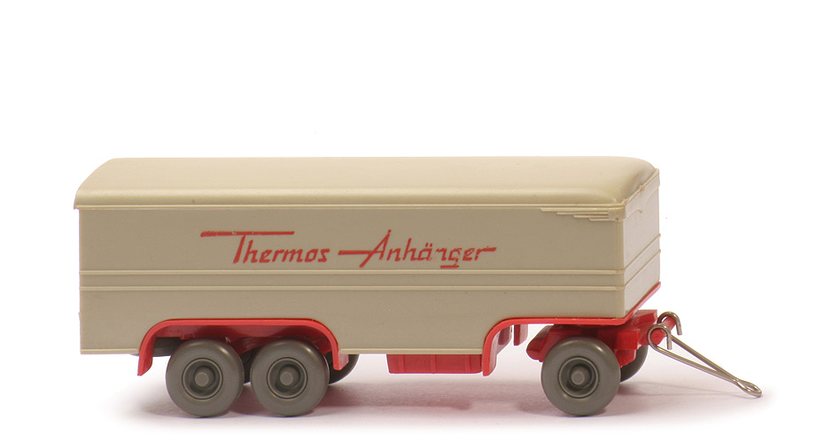 | | Kofferaufbau | | Korpus Farbe | ca. grünlichbeige | | Türen Farbe | ca. dunkelbraunweiß | | Rückleuchten | ohne | | Koffer Unterbau | ca. dunkelbraunweiß | | | Chassis | | Farbe | orangerot | | Achshalterungen | geschlossen | | Bodenprägung | WM im Kreis | | Werkzeugkasten | orangerot, unter Chassis geklebt | | Drehschemel | vernietet, mit silberner Kappe | | | weitere Details | | Beschriftung | Thermos Anhänger | | Beschriftung Art | Stempeldruck rot | | Reserverad | hinten unter Chassis, geklebt | | Deichsel | angesteckt, Draht | | Räder Typ | 12mm, ohne Profil | | Räder Farbe | ca. staubgrau |