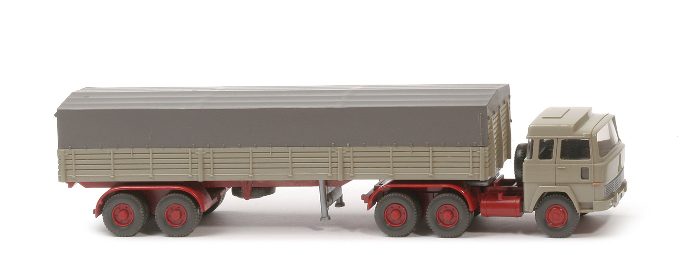 | Zugmaschine | Kabine oben | olivgrau | Kabine unten | olivgrau | Verglasung | klar | Inneneinrichtung | braunmetallic | Lenkrad | ohne | Grill | silber | Chassis | hellbraunrot | Radlauf hinten | hellbraunrot, 1-teilig | Sattelpfanne | für großen Königsbolzen | Reserverad | hinter Kabine | Räder | Profil grob | Felgen | hellbraunrot | | Auflieger | Farbe Pritsche | olivgrau | Pritschentyp | Holzpritsche mit Lasche | Chassis | rubinrot | Königsbolzen | stark | Pritscheneinlage | steingrau | Doppelachsaggregat | Klemmplatte | Doppelachsaggregat Farbe | hellbraunrot | Bodenprägung Achseinheit | Germany, Wiking | Reserverad | mittig unter Chassis | Stütze | starr, silbern, Hydraulikstempel | Plane | basaltgrau | Plane Art | Seite 1 Mark., vorne offen | Beschriftung | ohne | Räder | Profil grob | Felgen | hellbraunrot |
