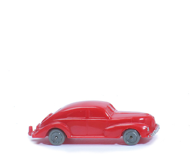 Achsen | Drahtachser | Typ | Haube gerundet ("spitz") | Farbe Karosserie | rot | Frontscheibe | geteilt | Kühlergrill | ein senkrechter Steg | hintere Stoßstange | geteilt, integrierter Zughaken | Zughaken | Zughaken integriert | Bodenprägung | WM Germany | Bemalung Scheinwerfer | silbern | Bemalung Kennzeichen vorne | silbern | Bemalung Stoßstange vorne | silbern | Bemalung Rückleuchten | ohne | Bemalung Kennzeichen hinten | ohne | Bemalung Stoßstange hinten | silbern | Räder Typ | Nabe gewölbt | Räder Farbe | staubgrau |