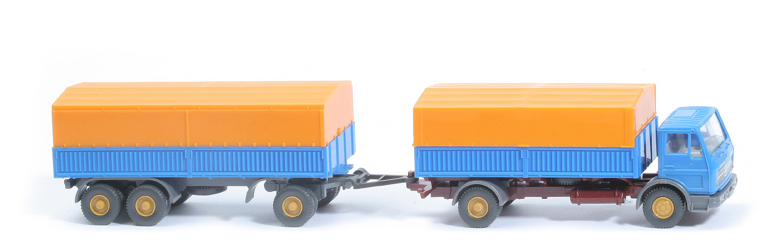 | | Zugwagen | | Kabine | signalblau | | Grill | Folie (!) | | Spiegelaufnahmen | mit | | Verglasung | klar | | Inneneinrichtung | hellolivgrau | | Kabinenunterteil | staubgrau | | vordere Kotflügel | ohne Wulst | | Scheinwerfer | silbern bemalt | | Chassistyp | Zughaken auf Dreieck | | Chassisfarbe | braunrot | | Radlauf hinten | staubgrau | | Reserverad | mittig unter Prtische | | Pritsche | signalblau | | Pritschengestell | braunrot | | Pritscheneinlage | lichtgrau | | Plane | orangegelb | | Räder | 12mm, Profil grob | | Felgen | senfgelb | | | Anhänger | | Pritsche | signalblau | | Chassis | staubgrau | | Deichsel | Kunststoff | | Reserverad | mittig unter Chassis | | Pritscheneinlage | silbergrau | | Plane | orangegelb | | Bereifung | Einfachbereifung | | Räder | 12mm, Profil grob | | Felgen | senfgelb | | Beschriftung | ohne |