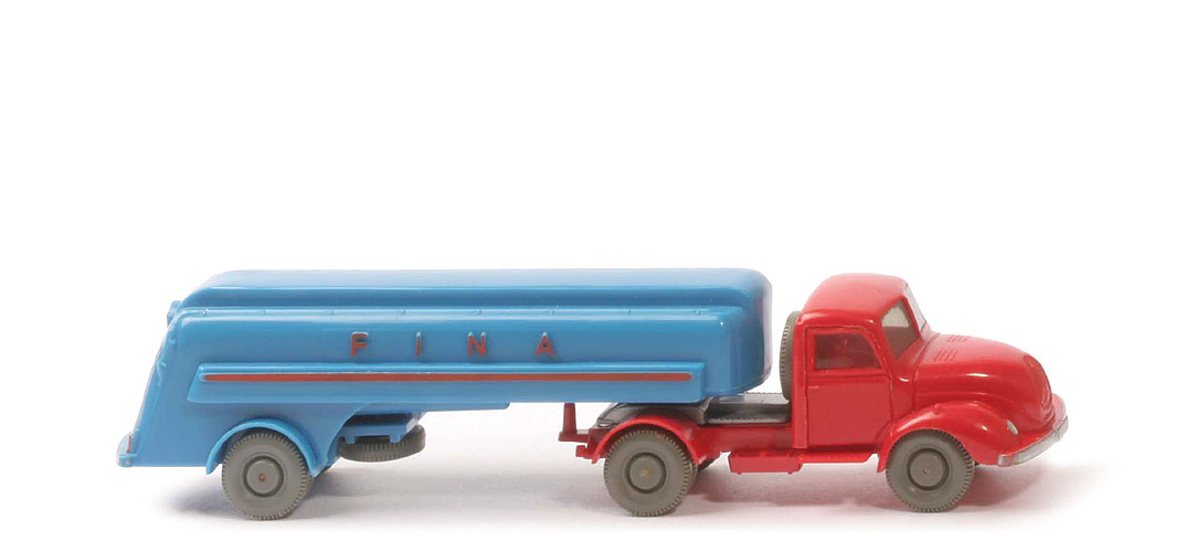 | | Zugmaschine | | Farbe Kabine | rot | | Version Kabine | Typ 4a | | Stoßstange | senkrecht | | Kabine unten | mit Schlitz | | Blinker | mit | | Verglasung | getönt | | Farbe Chassis | rot | | Bemalung | Scheinwerfer, Stoßstange | | Sattelpfanne | alt, mit Steg, für kleinen KöBo | | Achshalterungen | offen | | Bodenprägung | WM (ohne Kreis) | | Reserverad | hinter Kabine | | Räder | 11 mm | | | Auflieger | | Farbe Oberteil | himmelblau | | Farbe Unterteil | himmelblau | | Farbe Achseinheit | himmelblau | | Königsbolzen | integriert, ohne Ring | | Position Königsbolzen | zentral auf Aufnahmeplatte | | Bodenprägung Auflieger Chassis | ohne | | Achshalterungen | offen | | Bodenprägung Achseinheit | WM (ohne Kreis) | | geprägter Streifen | breit | | Beschriftung | Fina (s. Foto) | | Beschriftung Seite | geprägt | | Beschriftung Heck | Papieraufkleber | | Bemalung Rückleuchten | rot | | Bemalung Stoßstange | silber | | Räder | 11 mm |