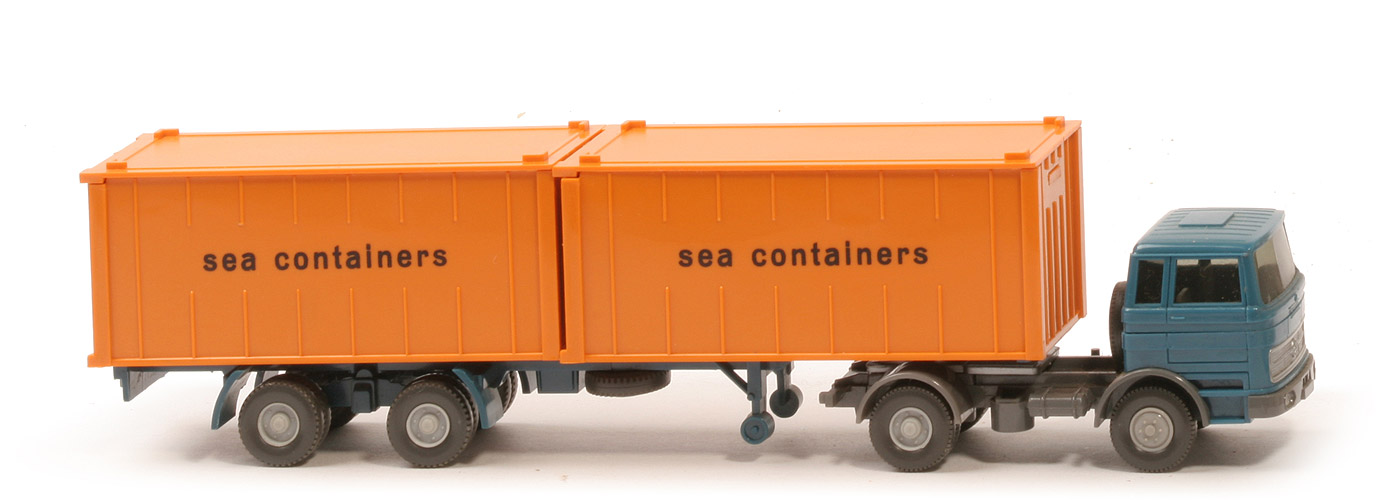 | Zugmaschine | Kabine oben | azurblau | Kabine unten | azurblau | Streifen | ohne | Verglasung | getönt | Inneneinrichtung | ca. hellgelbgrau | Lenkrad | ohne | Grill | silbern | Stoßstange, Radlauf vorn | basaltgrau | Chassistyp | neu | Chassisfarbe | basaltgrau | Radlauf hinten | basaltgrau | Reserverad | hinter Kabine | Sattelpfanne | für großen Königsbolzen | Räder | 12mm, Profil grob | Felgen | silbergrau | | Container | Art | 2 x 20 ft gerippt | Dach | gelborange | Korpus | gelborange | Türen | gelborange | Unterkante | schmal | Beschriftung | Sea Containers (s. Foto) | Beschriftung Art | Druck | | Auflieger | Farbe | ozeanblau | Unterfahrschutz | ohne | Königsbolzen | stark | Räder | 12mm, Profil grob | Felgen | silbergrau |