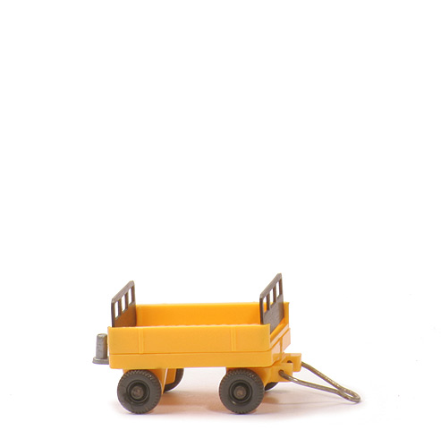 Pritsche | gelb | hier Bodenprägung | Germany, WM, 116a | Drehschemel | gelb, Bajonett-Verschluss | Zughaken | silbern, angeklebt | Aufbau | gelb | Gitter | Metall | Deichsel | Metall, kurz | Räder | ca. 7 mm, anthrazit |