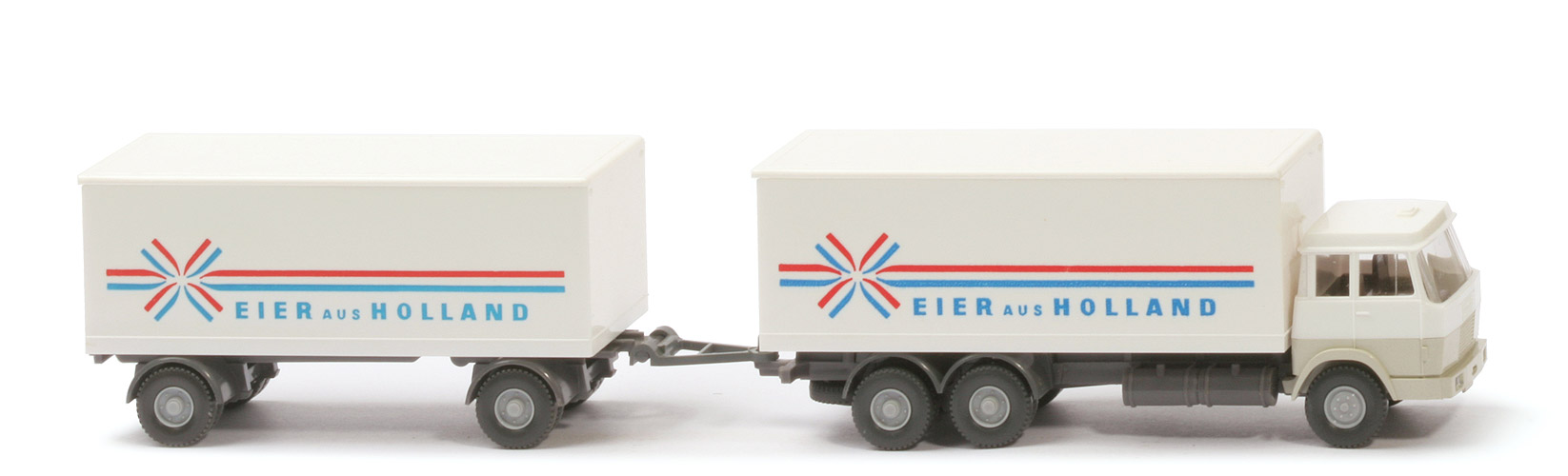 | Zugwagen | Kabine oben | weiß | Kabine unten | perlweiß | Verglasung | klar | Inneneinrichtung | 2 Sitze, Motorblock, ca. braunmetallic | Lenkrad | ohne | Scheinwerfer | unbemalt | Koffer Korpus | weiß | Koffer Dach | weiß | Koffer Türen | weiß | Druck | Eier aus Holland (s. Foto) | Chassis | basaltgrau | Radlauf hinten | basaltgrau, 2-teilig | Räder | Profil grob | Felgen | silbergrau | | Hänger | Koffer Korpus | weiß | Koffer Dach | weiß | Koffer Türen | weiß | Chassis | basaltgrau | Radläufe | basaltgrau | Druck | Eier aus Holland (s. Foto) | Räder | Profil grob | Felgen | silbergrau |