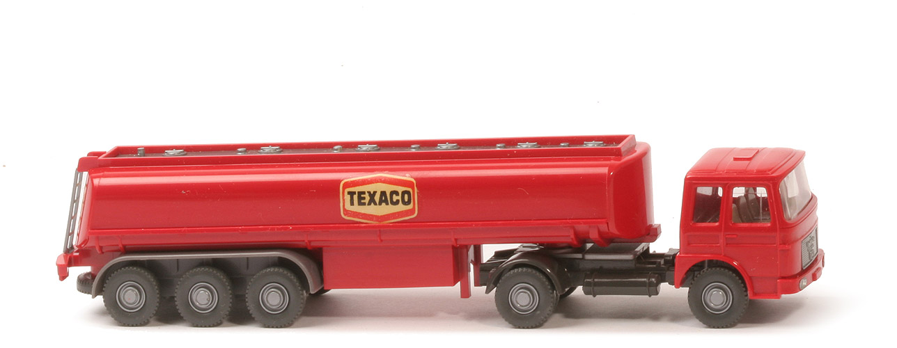 | | Zugmaschine | | Fahrerhaus | rot | | Verglasung | klar | | Inneneinrichtung | mit Lenkrad | | Spiegel | keine | | Scheibenwischer | keine | | Lüftergitter | ohne | | Grill | silbern, mit Löwe | | Motorblock | silbern | | Chassis | anthrazit | | Scheinwerfer | bemalt | | Räder | 12mm, Profil grob | | Radkappen | silbern | | | Auflieger | | Tank | rot | | Unterteil | rot | | Achseinheit | staubgrau | | Kotflügel Achseinheit | gerundet | | Leiter | mit | | Beschriftung Seite | TEXACO (Abziehbild) | | Beschriftung Heck | TEXACO (Abziehbild) | | Räder | 12mm, Profil grob | | Radkappen | silbern |