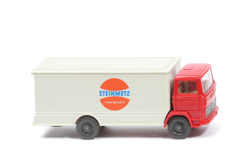 | Farbe Kabine | rot | | Spiegel | ohne | | Verglasung | klar | | Grill | silbern eingesetzt | | Bemalung vorne | ohne | | Inneneinrichtung | 2 Sitze, Motorblock | | Armaturenbrett, Lenkrad | ohne | | Farbe Innenrichtung | ca. hellgelbgrau | | Chassis Farbe | hellbraunrot | | Chassis Bodenprägung | GERMANY, WM | | Zughaken | ohne, entfernt | | Reserverad | hinten unter Chassis gesteckt | | Bemalung Rückleuchten | ohne | | Aufbau Typ | flacher Koffer | | Farbe Koffer | perlweiß | | Farbe Türen | perlweiß | | Farbe Kofferdach | perlweiß | | Koffer Bodenprägung | ohne | | Beschriftung | Steinmetz | | Beschriftung Art | Druck orange/himmelblau | | "herzhaft" | Negativdruck | | Räder | 11 mm, Standard |