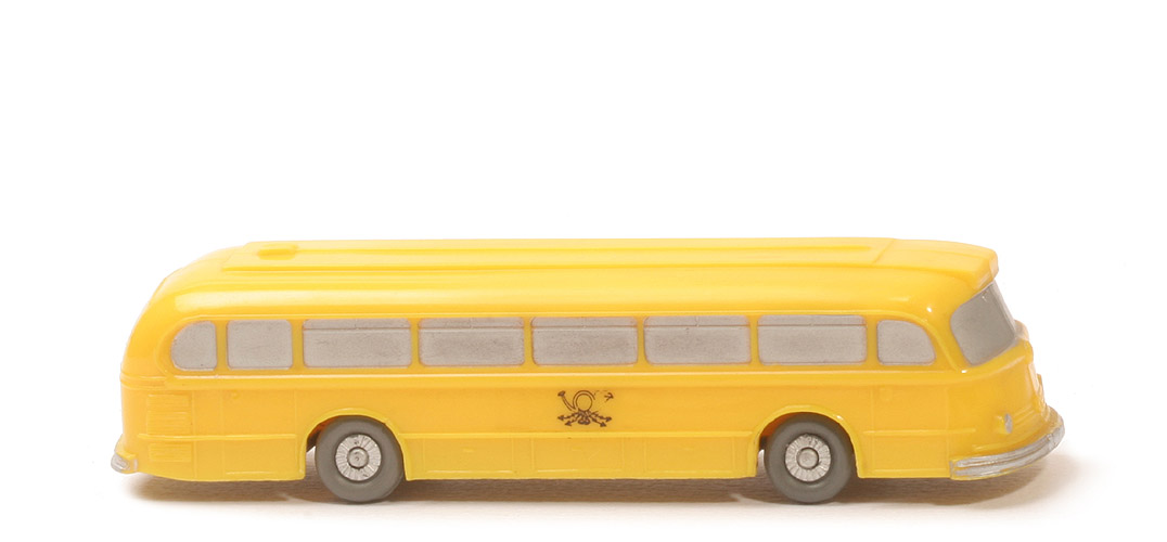Achsen | Rollachser | Verglasung | ohne | Farbe Karosserie | zinkgelb | Dach Mittelbereich | glatt, keine Lüfter | Kombination Dach/Gepäckbrücke | Kombination 1 | Heck | ohne Zughaken und ohne Rückleuchten | Gepäckbrücke | ohne | Chassis Farbe | basaltgrau | Chassis Typ | glatt, BP WM im Kreis | Achshalterungen | geschlossen | Scheiben | gesilbert | Bemalung vorne | Scheinwerfer, Stoßstange silbern | Bemalung Heck | Stoßstange, Kennzeichen silbern | Beschriftung | Posthorn groß (6mm) | Beschriftung Art | Druck | Räder | 12mm, einteilig, ohne Profil | Radkappen | silbern bemalt |