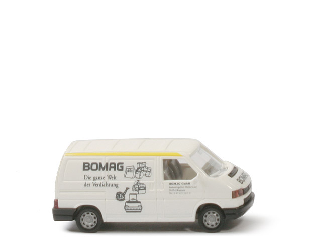 | Farbe Karosserie | weiß | | Grill und Lüftergitter | schwarz eingesetzt | | Tür hinten | Klappe | | Scheinwerfer | klar, eingesetzt | | Blinker vorne | rot transparent, eingesetzt | | Rückleuchten | rot transparent, eingesetzt | | Verglasung | klar | | Inneneinrichtung | Sitze nur eine Reihe, Lkr separiert | | Farbe Inneneinrichtung | ca. lichtgrau | | Chassis Farbe | schwarz | | Bodenprägung | neues Wiking-Logo, VW T 4, Germany | | Beschriftung Front | "Bomag" | | Beschriftung Seiten | "Bomag - Die ganze Welt der Verdichtung", ... | | Beschriftung Türen | "Bomag GmbH, ... [Kontaktdaten s.u.] | | Beschriftung Heck | "Bomag" | | weitere Bedruckung vorne | VW Emblem silbern | | weitere Bedruckung | Dachstreifen leuchtgelb | | Räder | aufgezogene Reifen | | Felgen | silbern |