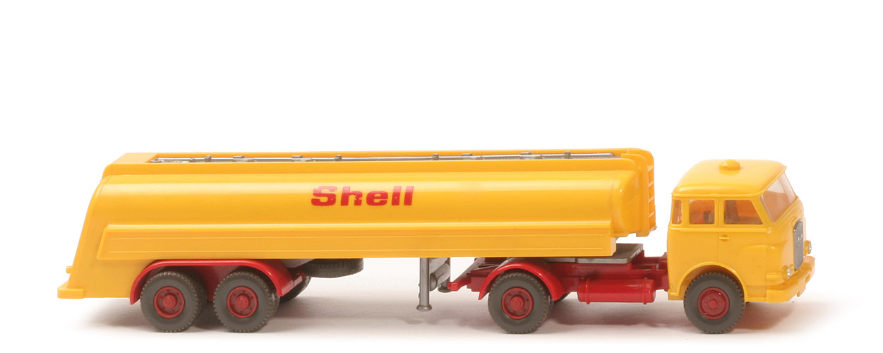 | Zugmaschine | Fahrerhaus | gelb | Verglasung | klar | Sitze | hellgelbgrau | Chassis | rot, neu für Reserverad | Zughaken | ohne | Sattelpfanne | für großen Königsbolzen | Fläche hinter Sattelpfanne | 3 Stege | Reserverad | mit | Räder | Profil grob | Felgen | hellbraunrot | | Auflieger | Farbe | gelb | Leiter | nicht gesilbert | Farbe Chassis, Armaturen | silber | Beschriftung Seite | Shell | Beschriftung Heck | altes Muschel-Logo mit Schrift | Beschriftung - Art | Druck | Beschriftung - Grösse | Seite 20mm, Heck 10x10mm | Achseinheit - Farbe | rot | Achseinheit - Variante | Bodenprägung Germany Wiking | Bodenprägung Chassis | Wiking (ohne 80 S) | Königsbolzen | groß | Reserverad | gesteckt | Räder | Profil grob | Felgen | hellbraunrot |