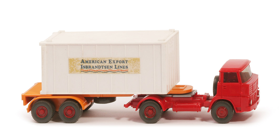 | Zugmaschine | Kabine oben | rot | Kabine unten | rot | Verglasung | getönt | Chassistyp | neu | Zughaken | ohne | Fläche hinter Sattelpfanne | 3 Stege | Chassisfarbe | rot | Sattelpfanne | für großen Königsbolzen | Reserverad | hinter Kabine | Räder | 12mm, Profil grob | Felgen | hellbraunrot | | Container | Art | 1 x 20 ft, gerippt | Dach | reinweiß | Korpus | reinweiß | Türen | reinweiß | Beschriftung | American Export ... (s. Foto) | Beschriftung Größe | 5 Felder, Papieraufkleber | | Auflieger | Farbe | gelborange | Variante | mit Markierung | Achseinheit Farbe | gelborange | Achshalterung | Klemmplatte | Räder | 12mm, Profil grob | Felgen | hellbraunrot |