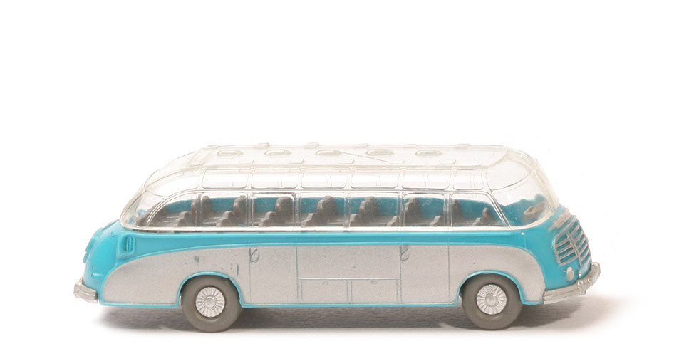 Karosserie Typ | Serie | Karosserie Farbe | dunkeladriablau | Schlitze für Dach | fast quadratisch | Armaturenbrett | rechteckig | Gestaltung Zierline Front | mit Punkt, gesilbert | Boden Fahrgastraum | glatt | Gestaltung Seite | Schablonierung silber | Fahrersitz Farbe | basaltgrau | Sitzreihen | basaltgrau, gesteckt | Fahrer | ohne Fahrer | Lenkrad Typ | groß, zwei Speichen | Lenkrad Farbe | ca. basaltgrau | Dach Befestigung | geklebt | Dach Gestaltung oben | glatt, ohne Schablonierung | Dach Typ Haltenasen | fast quadratisch | Chassis Farbe | basaltgrau | Chassis Typ | Typ 2 | Achshalterungen hierbei | geschlossen | Bodenprägung hierbei | WM im Kreis | Bemalung Hauptscheinwerfer | silber | Bemalung Nebelscheinwerfer | silber | Bemalung Grill und Zierlinie | silber | Bemalung Stoßstangen | silber | Bemalung Rückleuchten | rot | Bemalung Blinker hinten | rot | Bemalung Kennzeichen hinten | silber | Bemalung 3 Zierlinien hinten | silber | Bemalung Lüfter | ohne | Räder Typ | Trilex Bus, ohne Profil | Räder Ausführung | staubgrau, Felgen gesilbert |