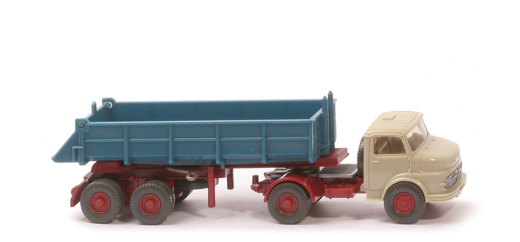 | Zugmaschine | Farbe Kabine | hellgelbgrau | Lüfter | mit | Eckfenster | ohne | Blinker | neben dem Grill | Inneneinrichtung | ca. graubeige | Verglasung | klar | Chassis | hellbraunrot | Radlauf hinten | hellbraunrot | Sattelpfanne | für großen Königsbolzen | Reserverad | hinter Kabine | Räder | 12mm, Profil grob | Felgen | hellbraunrot | | Auflieger | Farbe Mulde und Klappe | azurblau | Farbe Chassis | hellbraunrot | Bodenprägung Chassis | Wiking Germany | Farbe Scharnierhalterung | hellbraunrot | Farbe Achshalterung | hellbraunrot | Bodenprägung Achshalterung | 67 S | Königsbolzen | stark | Reserverad | unter Chassis | Räder | 12mm, Profil grob | Felgen | hellbraunrot |