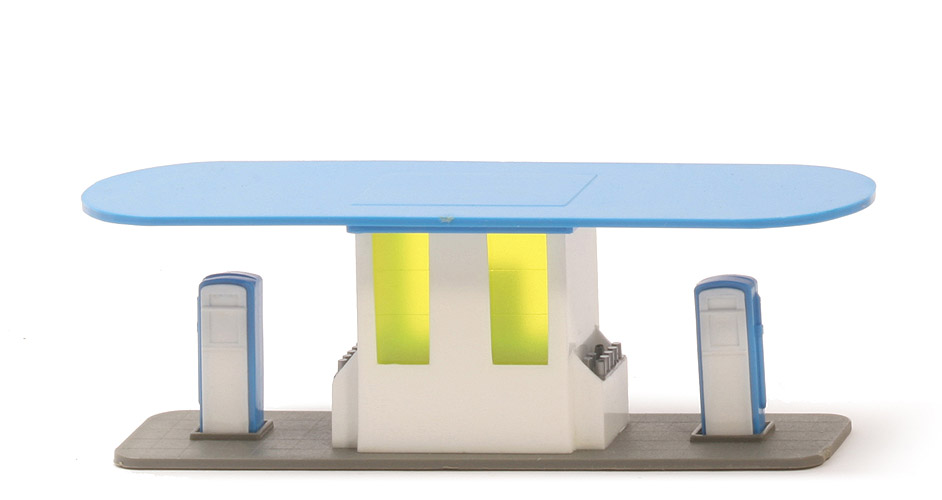 | Dach Typ | gerundet, mattiert | | Dach Farbe | himmelblau | | Gebäude Typ | verglast | | Gebäude Farbe | weiß | | Verglasung | gelbgrün transparent | | Öldosen | silbern, separat eingesetzt | | Zapfsäulen | himmelblau/weiß | | Bodenplatte Farbe | basaltgrau | | Bodenplatte Oberseite | Kachel-Struktur | | Bodenplatte | unten glatt, umlaufende Kante | | Bodenprägung | WM WIKING |