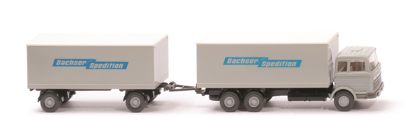 Kabine Typ | Dach querversteift | Kabine Farbe | silbergrau | Spiegel | ohne | Scheibenwischer | ohne | Verglasung | klar | Lenkrad | ohne | Inneneinrichtung | ca. hellgelbgrau | Grill | silbern eingesetzt | Stoßstange | basaltgrau | Chassis | schwarz | Zughaken | mit | Bemalung | ohne | Radlauf hinten | zweiteilig, schwarz | Reserverad | hinten unter Chassis | Kofferkorpus | silbergrau | Kofferdach | weiß | Türen (!) | silbergrau | Beschriftung | Dachser Spedition (s. Foto) | Beschriftung Art | Druck blau | Räder | Profil grob | Felgen | silbergrau |