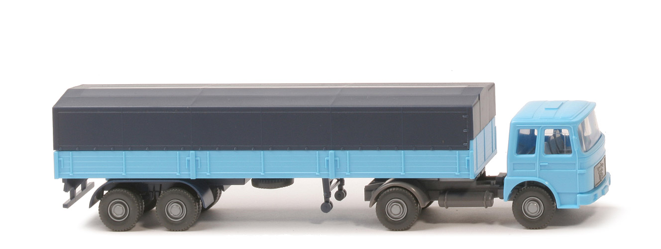 | Zugmaschine | Fahrerhaus | hellblau | Verglasung | klar | Inneneinrichtung | ohne Lenkrad, silbergrau | Spiegel | mit | Scheibenwischer | ohne | Lüftergitter | ohne | Grill | silbern, mit Löwe | Motorblock | silbern | Chassis | basaltgrau | Räder | 12mm, Profil grob | Radkappen | silbern | | Auflieger | Farbe | hellblau | Pritscheneinlage | ca. lichtgrau | Chassis | stahlblau | Stütze | Rollen | Plane | stahlblau | Druck | ohne | Räder | 12mm, Profil grob | Radkappen | silbern |