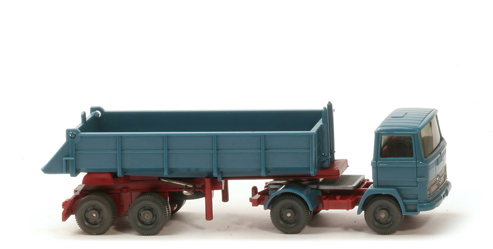 | Zugmaschine | Farbe Kabine | azurblau | Spiegel | ohne | Verglasung | getönt | Inneneinrichtung | ca. hellbraunrot | Lenkrad | ohne | Grill | silbern mit Stern | Reserverad | ohne | Farbe Chassis | hellbraunrot | Kardanelement | basaltgrau | Sattelpfanne | für großen Königsbolzen | Radlauf hinten | azurblau | Zughaken | einfach | Räder | 11mm, einteilig, Profil fein | | Auflieger | Farbe Mulde und Klappe | azurblau | Farbe Chassis | hellbraunrot | Bodenprägung Chassis | Wiking Germany | Farbe Scharnierhalterung | hellbraunrot | Farbe Achshalterung | hellbraunrot | Bodenprägung Achshalterung | 67 S | Königsbolzen | stark | Reserverad | unter Chassis | Räder | 11mm, einteilig, Profil fein |