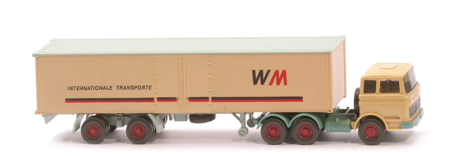 | Zugmaschine | Typ | Dach längsversteift | Kabine | hellbeige | Spiegel | ohne | Scheibenwischer | ohne | Verglasung | getönt | Lenkrad | ohne | Inneneinrichtung | ca. lichtgrau (?) | Stoßstange | türkis | Chassis | türkis | Zentriernippel für Pritsche | ohne | Radlauf hinten | zweiteilig türkis | Reserverad | hinter Kabine | Sattelpfanne | für großen KöBo | Räder | Profil grob | Felgen | hellbraunrot | | Auflieger | Koffer Typ | mit Andeutung der Seitentür | Koffer Seiten | mattiert, 8-fach geteilt | Farbe Dach | lichtgrün | Farbe Korpus | hellbeige | Farbe Türen | hellbeige | Beschriftung | Internationale Transporte WM | Beschriftung Art | Druck rot/schwarz | Gestaltung Streifen | Streifen rot/schwarz zusammenliegend | Chassis Farbe | lichtgrün | Unterfahrschutz | ohne | Königsbolzen | stark | Räder | Profil grob | Felgen | hellbraunrot |
