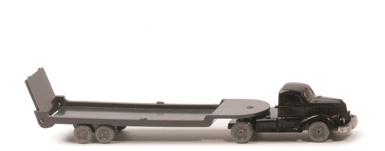 Achsen | Drahtachser | | Zugmaschine | Farbe | schwarz | Bemalung | Scheinwerfer, Stoßstange silbern | Bodenprägung | keine | Reserverad | ohne | Räder | glasiges basaltgrau | | Auflieger | Achsen | Drahtachser | Farbe | anthrazit | Typ | vorn rund (Typ 1) | Seilwinde | ohne | Fläche über Drehschemel | mit Prägung WM im Kreis | Rückleuchten | ohne | Rampe | kurz | Stützen | ohne | Bodenprägung | ohne | Königsbolzen | lang | Räder | 8mm, o. Profil, glasiges basaltgrau |