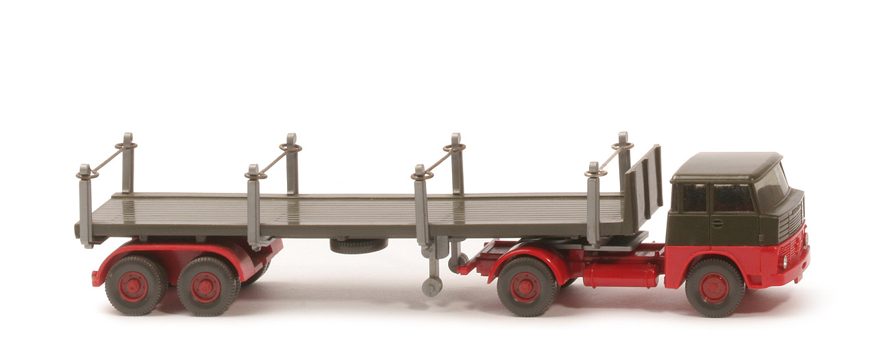 | Zugmaschine | Kabine oben | olivgrün | Kabine unten | rot | Verglasung | getönt | Chassistyp | alt | Zughaken | ohne | Fläche hinter Sattelpfanne | geriffelt | Chassisfarbe | rot | Sattelpfanne | für den kleinen KöBo | Reserverad | ohne | Räder | 12mm, Profil fein | Felgen | hellbraunrot | | Auflieger | Farbe | olivgrün | Achseinheit Farbe | rot | Typ Achseinheit | Made in Germany 2b | Achseinheit Kennzeichen | mit | Rungen | silber | Bolzen | dünn, integriert | Räder | 12mm, Profil fein | Felgen | hellbraunrot |