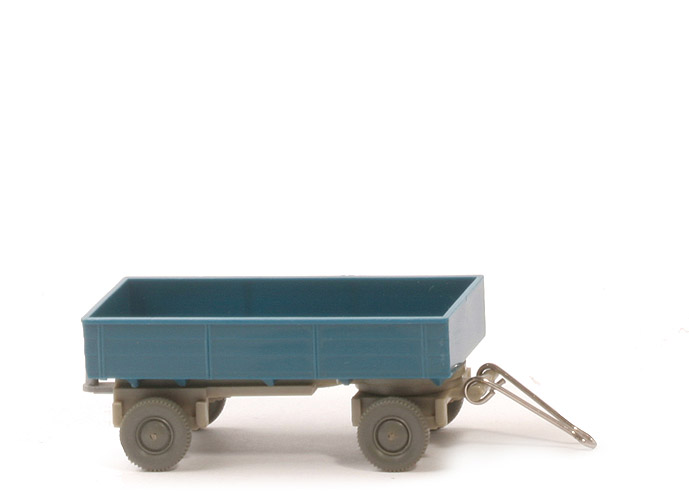 | Pritsche | Pritsche Farbe | azurblau | Pritschenseiten | mit Struktur | Pritscheneinlage | ohne | Kennzeichen hinten | zweiteilig | | Chassis | Chassis Variante | Typ 2 | Chassis Farbe | hellolivgrau | Achshalterungen | offen | Drehschemel | eingesteckt | Bodenprägung Drehschemel | WM | Bodenprägung Chassis | ohne | Zughaken | silbern, Typ LKW, unter Chassis geklebt | | weitere Details | Deichsel | Metall | Bemalung Rückleuchten | ohne | Bemalung Kennzeichen | ohne | Räder | 10 mm, staubgrau, neuere Ausführung |