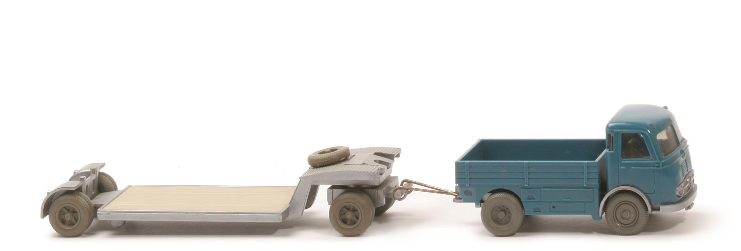 | Zugmaschine | Kabine Farbe | azurblau | Fenstersteg | breit | Fixierung Reserverad | mit | Verglasung | klar | Inneneinrichtung | hellbraunrot | Grill | silbern eingesetzt | Chassis | silbern | Bodenprägung | WM, Made in Germany | hintere Stoßstange links | mit | Zughaken | mit | hintere Stoßstange rechts | ohne | Pritsche | azurblau | Pritscheneinlage -Typ | ohne | Räder | 12mm, hellgrau, 10-Loch | Ladegut | ohne | | Anhänger | Grundfarbe | silber | Hängertyp | Typ 1: Zapfen mit Justierung | Pritscheneinlage | hellgelbgrau | Deichsel | Metall | Bemalung Rückleuchten | rot | Bemalung Rückstrahler | rot | Räder | 12mm, hellgrau, Trilex |