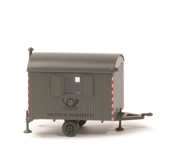 Aufbau | dunkles betongrau | Tür | dunkles betongrau, zum Öffnen | Ofenloch | mit schwarzem Abgasrohr | Verglasung | klar | Inneneinrichtung | anthrazit | Dach | anthrazit | Bodenprägung | neues WIKING-Logo, Germany | Deichselelement | anthrazit | Stützen | anthrazit | Bedruckung | Posthorn, "Deutsche Bundespost" | weitere Bedruckung | Warnbaken rot/weiß Aufbaukanten, hinten 25 "km" | Räder | Pkw-Standard, Nabe glatt, anthrazit |