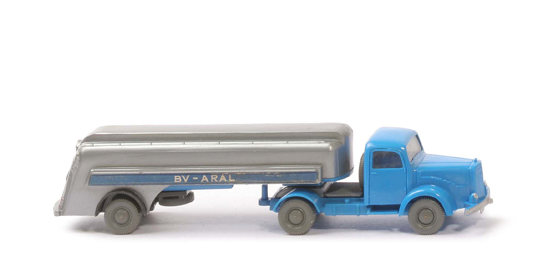 | Zugmaschine | Farbe Kabine | himmelblau | Version Kabine | ohne Schlitz hinter Nrn-Schild | Blinker | ohne | Verglasung | getönt | Farbe Chassis | himmelblau | Bemalung | Scheinwerfer, Stoßstange | Sattelpfanne | alt, ohne Steg, für kleinen KöBo | Achshalterungen | geschlossen | Bodenprägung | WM (ohne Kreis) | Reserverad | ohne | Räder | 10mm, neuere Ausführung | | Auflieger | Farbe Oberteil | silber | Farbe Unterteil | himmelblau | Farbe Achseinheit | anthrazit | Königsbolzen | integriert, mit Ring | Position Königsbolzen | zentral auf Aufnahmeplatte | Bodenprägung Auflieger Chassis | ohne | Achshalterungen | geschlossen | Bodenprägung Achseinheit | WM im Kreis | geprägter Streifen | schmal | Beschriftung | BV-ARAL (s. Foto) | Beschriftung Art | Papieraufkleber, auch Heck | Bemalung | ohne | Räder | 10mm, neuere Ausführung |