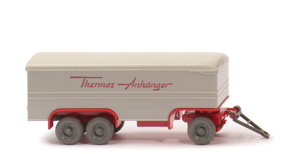| Kofferaufbau | Korpus Farbe | achatgrau | Türen Farbe | achatgrau | Rückleuchten | mit | | Chassis | Farbe | rot | Achshalterungen | offen | Bodenprägung | WM u.Germany | Werkzeugkasten | rot, unter Chassis geklebt | Drehschemel | eingesteckt | | weitere Details | Beschriftung | Thermos Anhänger | Beschriftung Art | Stempeldruck rot - leicht via lila | Reserverad | hinten unter Chassis, geklebt | Deichsel | angesteckt, Kunststoff anthrazit | Räder Typ | 12mm, mit Profil | Räder Farbe | ca. basaltgrau |