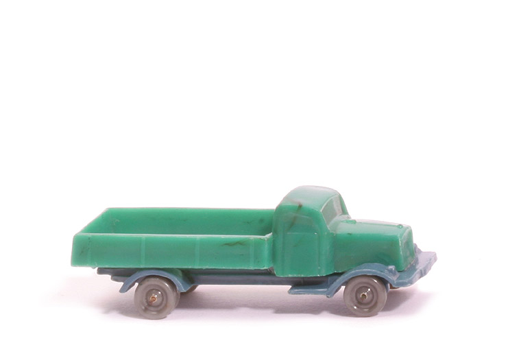 | Achsen | Drahtachser | | Aufbau | grün | | Stoßstange | anliegend | | Seitenlüfter Motorhaube | ohne | | Scheibenwischer | ohne | | Winker | ohne | | Querverbretterung Pritsche | ohne | | Zughaken | in Pritsche integriert (leider abfrakturiert) | | Chassis | mattgraublau | | Bodenprägung | WM, darunter: MADE IN GERMANY | | Bemalung Scheiben | ohne | | Bemalung Scheinwerfer vorne | ohne | | Bemalung Kennzeichen vorne | ohne | | Bemalung Kennzeichen hinten | ohne | | Bemalung Rückleuchte | ohne | | Räder Typ | 10 mm, ohne Profil | | Räder Farbe | glasiges basaltgrau |