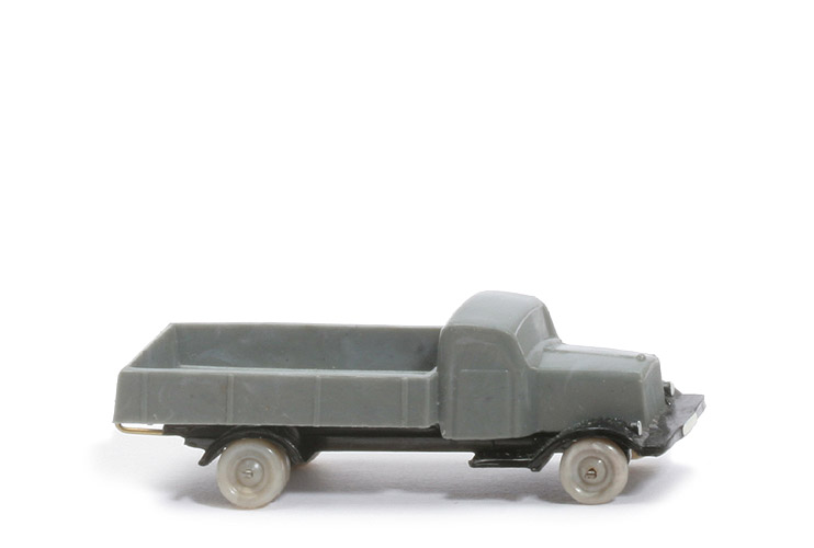 | Achsen | Drahtachser | | Aufbau | ca. betongrau | | Stoßstange | anliegend | | Seitenlüfter Motorhaube | ohne | | Scheibenwischer | ohne | | Winker | ohne | | Querverbretterung Pritsche | ohne | | Chassis | schwarz | | Bodenprägung | WM, darunter: MADE IN GERMANY | | Zughaken | Draht, ins Chassis eingelassen | | Bemalung Scheiben | ohne | | Bemalung Scheinwerfer vorne | weiß | | Bemalung Kennzeichen vorne | weiß | | Bemalung Kennzeichen hinten | weiß | | Bemalung Rückleuchte | ohne | | Räder Typ | 10 mm, ohne Profil | | Räder Farbe | glasiges mischgrau |