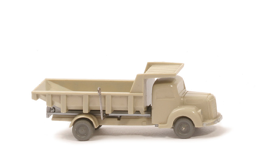 Achsen | Rollachser | Farbe Kabine u. Chassis | hellgelbgrau | Kabinenboden | silberne Platte | Bodenplatte Prägung | WM im Kreis | Typ Chassis | mit Kipperschlitz | Mulde Farbe | hellgelbgrau | Mulde Typ | mit Struktur | Kippmechanimus | Hebel einteilig | Kippscharnier | breit, silbern | silberne Halteplatte auf CH | lang | Kipphebel | (immer) Beifahrerseite | Bemalung Scheinwerfer | silber | Bemalung Kennzeichen vorne | silber | Bemalung Stoßstange | silber | Räder | 10mm, ältere Ausführung staubgrau |