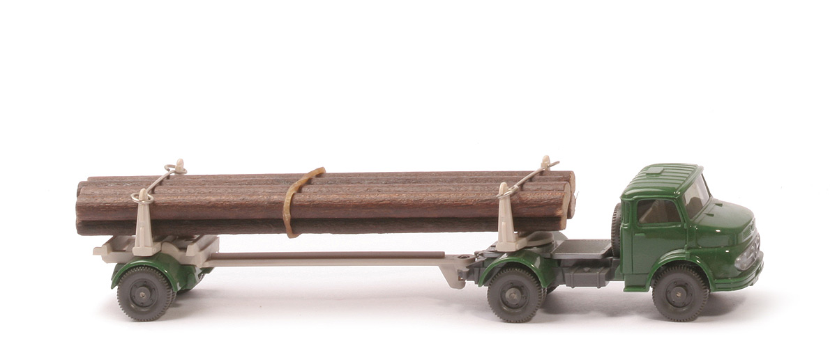| Zugmaschine | Farbe Kabine | laubgrün | Lüfter | mit | Eckfenster | mit | Blinker | auf Kotflügel | Verglasung | getönt | Inneneinrichtung | ca. hellgelbgrau | Chassis | anthrazit | Radlauf hinten | laubgrün | Sattelpfanne | für großen Königsbolzen | Reserverad | hinter Kabine | Räder | 11mm, einteilig, Profil fein | | Auflieger | Rungen | hellelfenbein | Deichsel | hellelfenbein | Gestaltung Deichsel | Zughaken übergreifend | Radlauf | laubgrün | Königsbolzen | stark | Reserverad | unter Chassis | Räder | 11mm, einteilig, Profil fein | Ladung | 7 Baumstämme | Befestigung der Ladung | Gummibänder |