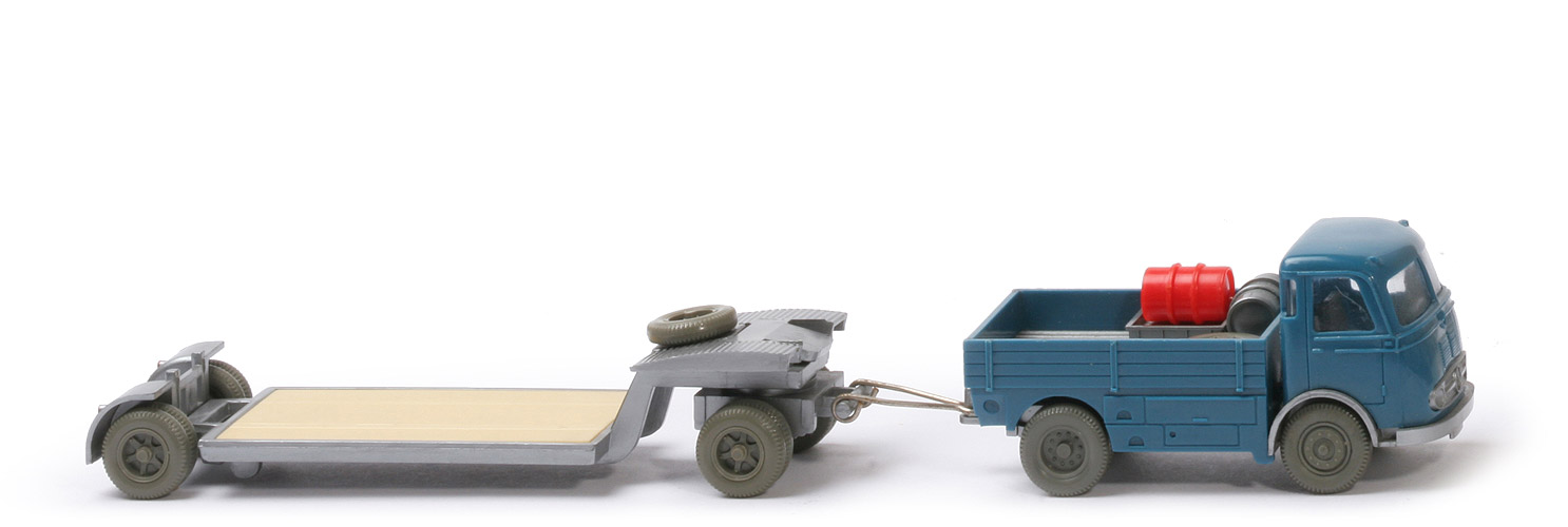 | Zugmaschine | Kabine Farbe | azurblau | Fenstersteg | breit | Fixierung Reserverad | mit | Verglasung | klar | Inneneinrichtung | hellbraunrot | Grill | silbern eingesetzt | Chassis | silbern | Bodenprägung | WM, Made in Germany | hintere Stoßstange links | mit | Zughaken | mit | hintere Stoßstange rechts | ohne | Pritsche | azurblau | Pritscheneinlage -Typ | 12-fach geteilt | Pritscheneinlage - Farbe | silbern | Räder | 12mm, hellgrau, 10-Loch | Ladegut | allerlei, verklebt | | Anhänger | Grundfarbe | silber | Hängertyp | Typ 2: Zapfen ohne Justierung | Pritscheneinlage | hellbeige | Deichsel | Metall | Bemalung Rückleuchten | rot | Bemalung Rückstrahler | rot | Räder | 12mm, hellgrau, Trilex |