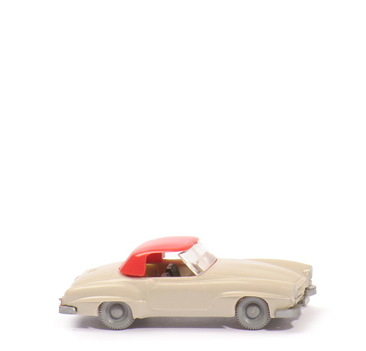 Farbe Karosserie | hellolivgrau | Kennzeichen hinten | Teil der Karosserie | Windschutzscheibe | separat eingeklebt | Scheinwerfer | silbern bemalt | Verdeck | orangerot | Sitze | schwarz | Lenkrad Art | separat eingesetzt, 2-speichig | Lenkrad Farbe | ca. hellelfenbein | Chassis Farbe | silbern | Achshalterungen | geschlossen | Bodenprägung | WM | Bemalung Blinker vorn | silbern | Bemalung Grill | immer ohne | Bemalung Rückleuchten | rot | Bemalung Kennzeichen hinten | silbern | Räder Typ | 8 mm | Räder Farbe | ca. staubgrau |