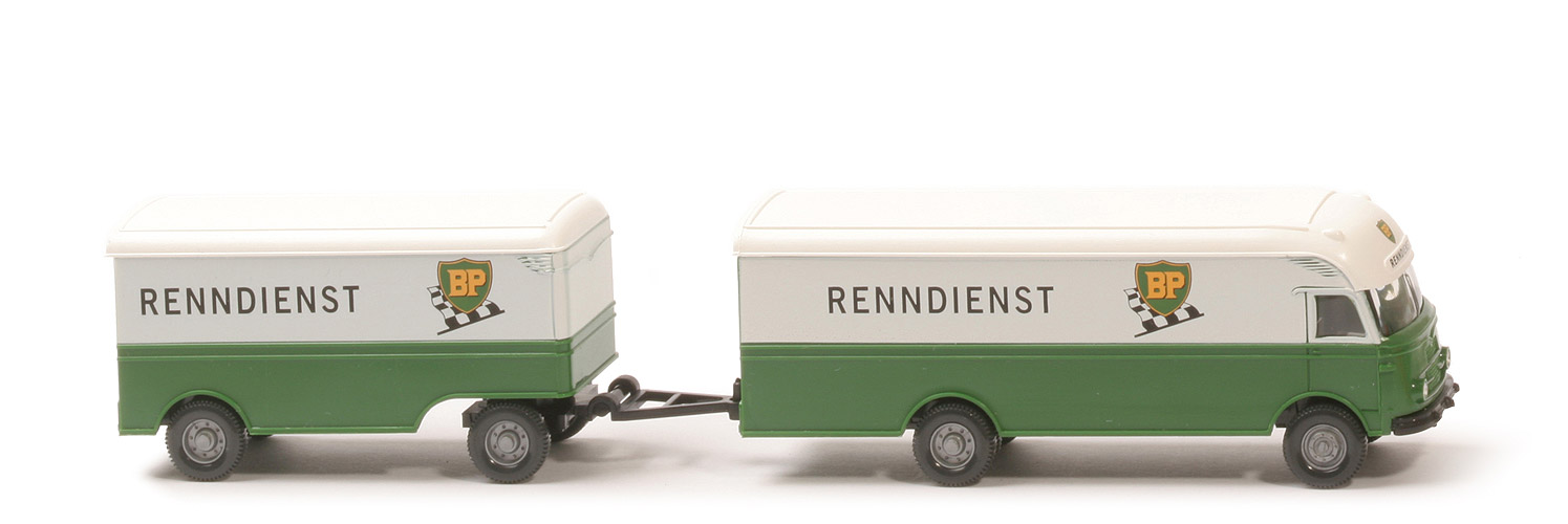| Zugwagen | Aufbau Farbe | dunkles maigrün, oben weiß schabloniert | Blinker vorne | mit | Verglasung | klar | Inneneinrichtung | ca. basaltgrau | Fahrer | ohne | Kotflügel | Teil des Aufbaus | Rückleuchten | klein | Dach Farbe | weiß | Dach Art | matt, mit Positionsleuchten, mit Streben | Türen | dunkles maigrün | Türen Art | Typ 3: niedrig, mit Streben, mit Griff | Chassis Art | Typ 4 | Chassis Farbe | schwarz | Bodenprägung Motorblock | Punkt | Bodenprägung hinten | WIKING Germany | Achshalterung vorne | offen | Achshalterung hinten | offen | Fläche unter hinterem Kardan | geschlossen | Fläche hinter Hinterachse | geschlossen | Tank | ohne | Beschriftung | "Renndienst", BP-Logo ... (s. Foto) | Beschriftung Art | Druck ca. weinrot | | Anhänger | Ausführung | wie Zugwagen | Bodenprägung | Wiking Germany | Deichsel | schwarz | | Räder | Typ | 11 mm, 2-teilig | Felgen | 8-Loch, silbern |