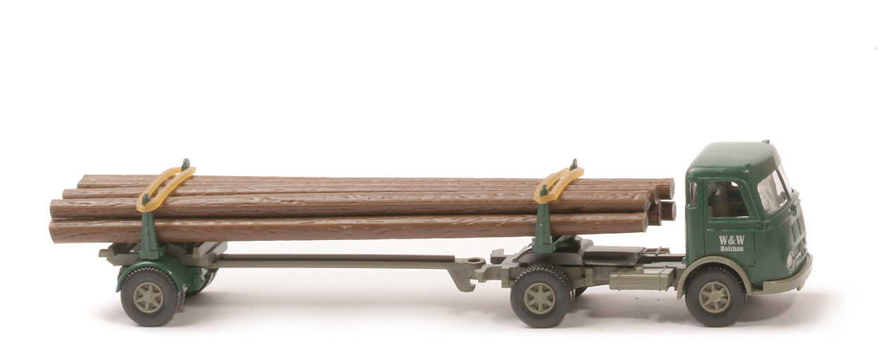 | Zugmaschine | Kabine | kieferngrün, Türdruck "W&W, Holzbau" | Fenstersteg | breit | Fixierung Reserverad | mit | Verglasung | leicht getönt | Inneneinrichtung | ca. betongrau | Grill | integriert, Scheinwerfer, Stern, Zierlinien gesilbert | Chassis | ca. betongrau | Bodenprägung | neues Wiking-Logo | hintere Stoßstange links | mit | Zughaken | mit, Mikro-Ausführung | hintere Stoßstange rechts | mit | Reserverad | hinter Kabine | Sattelpfanne | für großen Bolzen mit Steg | Räder | 12 mm, Trilex-Felgen neu, ca. betongrau | | Auflieger | Rungen | kieferngrün | Deichsel | ca. betongrau | Gestaltung Deichsel | Zughaken übergreifend | Kotflügel | kieferngrün | Königsbolzen | stark | Ladung Typ | 8 Rundhölzer 120 mm, Kunststoff | Ladung Farbe | ca. blassbraun | | Ladung Befestigung | Räder | 12 mm, Trilex-Felgen neu, ca. betongrau |