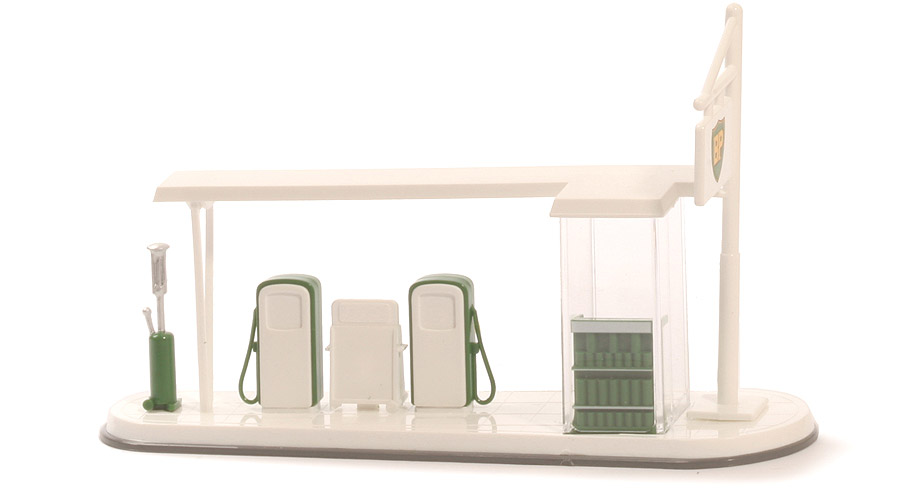 Dach | weiß | Verkaufsraum | klar verglast | hier Tresen | dunkles maigrün, mit Öldosen-Auslagen | Bemalung Tresen | Zierkanten silbern | Zapfsäulen Umrandung | dunkles maigrün | Zapfsäulen Korpus | weiß | Werbeaufsteller zw. Zapfsäulen | weiß | Zweitakt-Säule | dunkles maigrün, Pumpmechnismus gesilbert | Boden | weiß, Kachel-Struktur | Bodenplatte | basaltgrau | hier Bodenprägung | neues WIKING-Logo | seitlicher Werbeauftsteller | weiß | hier Logo | "BP", gedruckt |