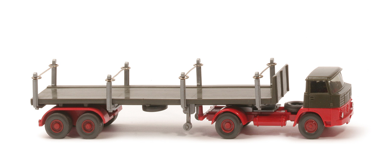 | Zugmaschine | Kabine oben | olivgrün | Kabine unten | rot | Verglasung | getönt | Chassistyp | alt | Zughaken | mit | Fläche hinter Sattelpfanne | geriffelt | Chassisfarbe | rot | Sattelpfanne | für den kleinen KöBo - mit Steg | Reserverad | flach hinter Kabine | Räder | 12mm, Profil fein | Felgen | hellbraunrot | | Auflieger | Farbe | olivgrün | Achseinheit Farbe | rot | Typ Achseinheit | Made in Germany 2b | Achseinheit Kennzeichen | mit | Rungen | silber | Bolzen | dünn, integriert | Räder | 12mm, Profil fein | Felgen | hellbraunrot |