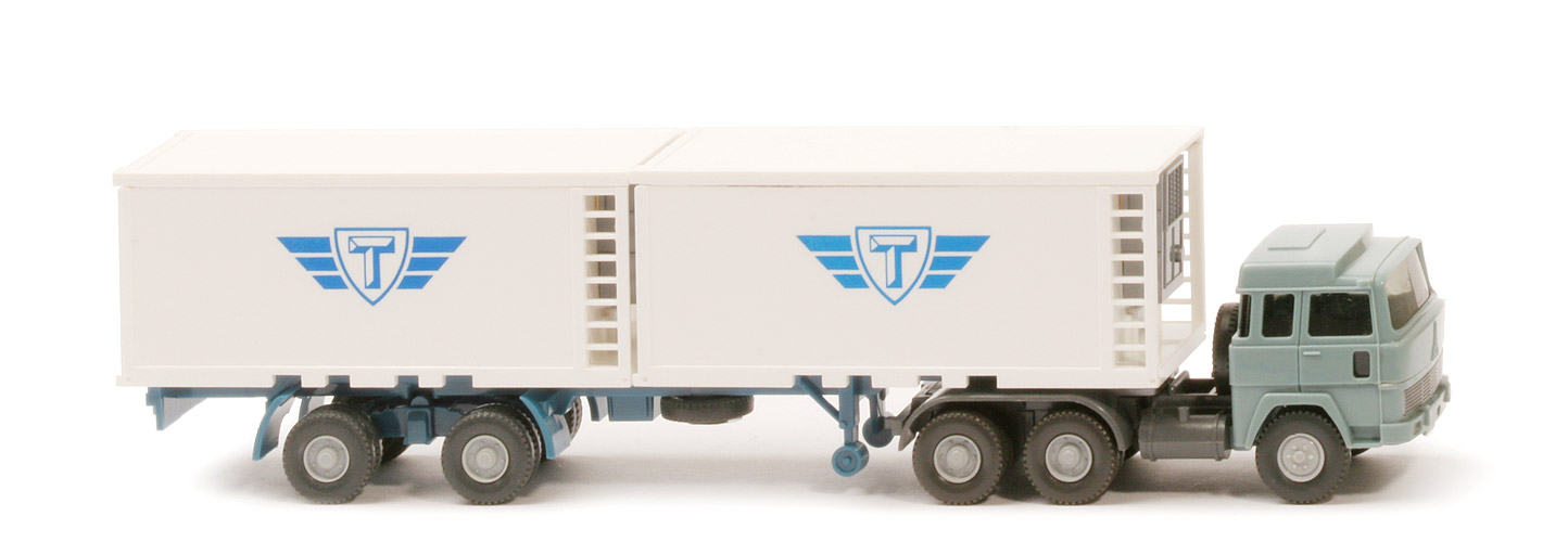 | Zugmaschine | Kabine oben | grünblau | Kabine unten | grünblau, Scheinwerfer gesilbert | Verglasung | getönt | Inneneinrichtung | ca. basaltgrau | Lenkrad | ohne | Grill | silber | Chassis | staubgrau | Radlauf hinten | staubgrau, 1-teilig | Sattelpfanne | für großen Königsbolzen | Reserverad | hinter Kabine | Räder | Profil grob | Felgen | 6-Loch, silbergrau | | Container | Art | 2 x 20 ft Kühlcontainer | Farbe | weiß | Kühlaggregat | silbern | Türen | alt | Beschriftung | Tiefkühlsymbol | Beschriftung Art | Druck ca. capriblau | | Auflieger | Farbe | azurblau | Unterfahrschutz | ohne | Königsbolzen | stark | Räder | Profil grob | Felgen | 6-Loch, silbergrau |