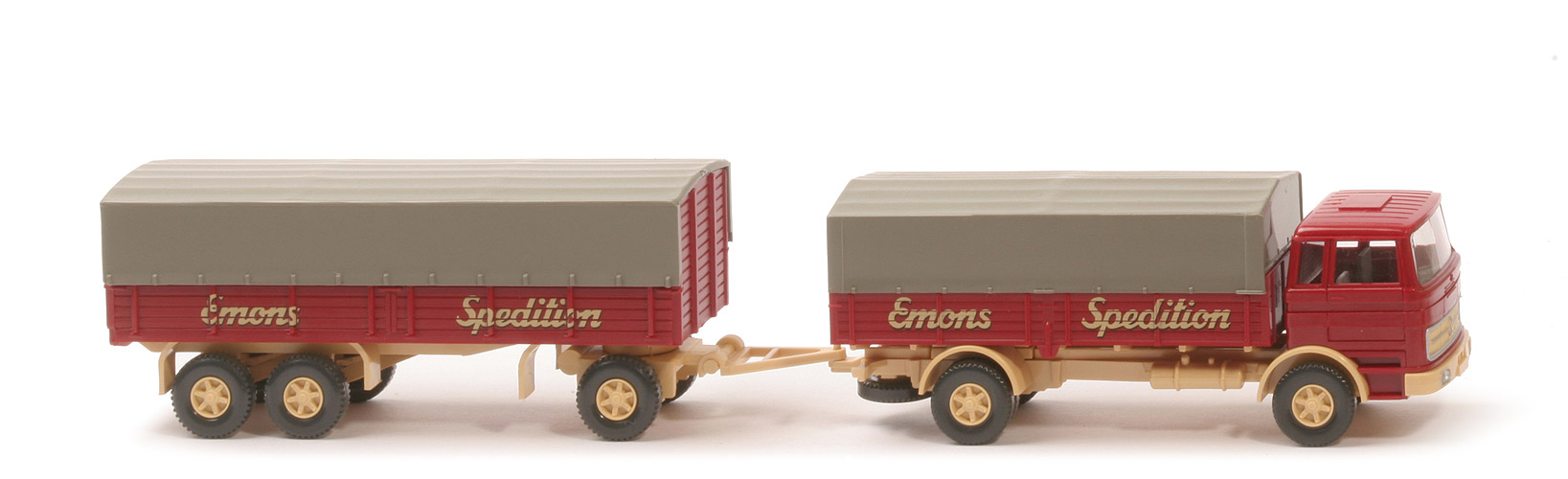 | Zugwagen | Kabine oben | "purpurrot" | Kabine unten | "purpurrot" | Streifen | ohne | Verglasung | klar | Inneneinrichtung | ca. basaltgrau | Lenkrad | integriert | Stoßstange, Radlauf vorn | hellbeige | hier Aussparung | mit | Chassistyp | Neuauflage: neues WIKING-Logo, kleiner Zughaken | Chassisfarbe | hellbeige | Radlauf hinten | hellbeige | Reserverad | gesteckt | Pritsche | "purpurrot" | Pritschengestell | hellbeige | Pritscheneinlage | "purpurrot" | Plane | ca. betongrau | Räder | 12mm, Felgen Trilex, hellbeige | Beschriftung | Emons Spediton (s.Foto) | | Anhänger | Pritsche | "purpurrot" | Rückleuchten | mit | Pritsche Bodenprägung | neues WIKING-Logo | Chassis Farbe | hellbeige | Chassis Bodenprägung | neues WIKING-Logo | Achshalterungen | nach vorne offen | Drehschemel | hellbeige, Bajonettverschluss | Deichsel | hellbeige, Öse klein | Plane | ca. betongrau | Räder | 12mm, Felgen Trilex, hellbeige | Beschriftung | Emons Spediton (s.Foto) |